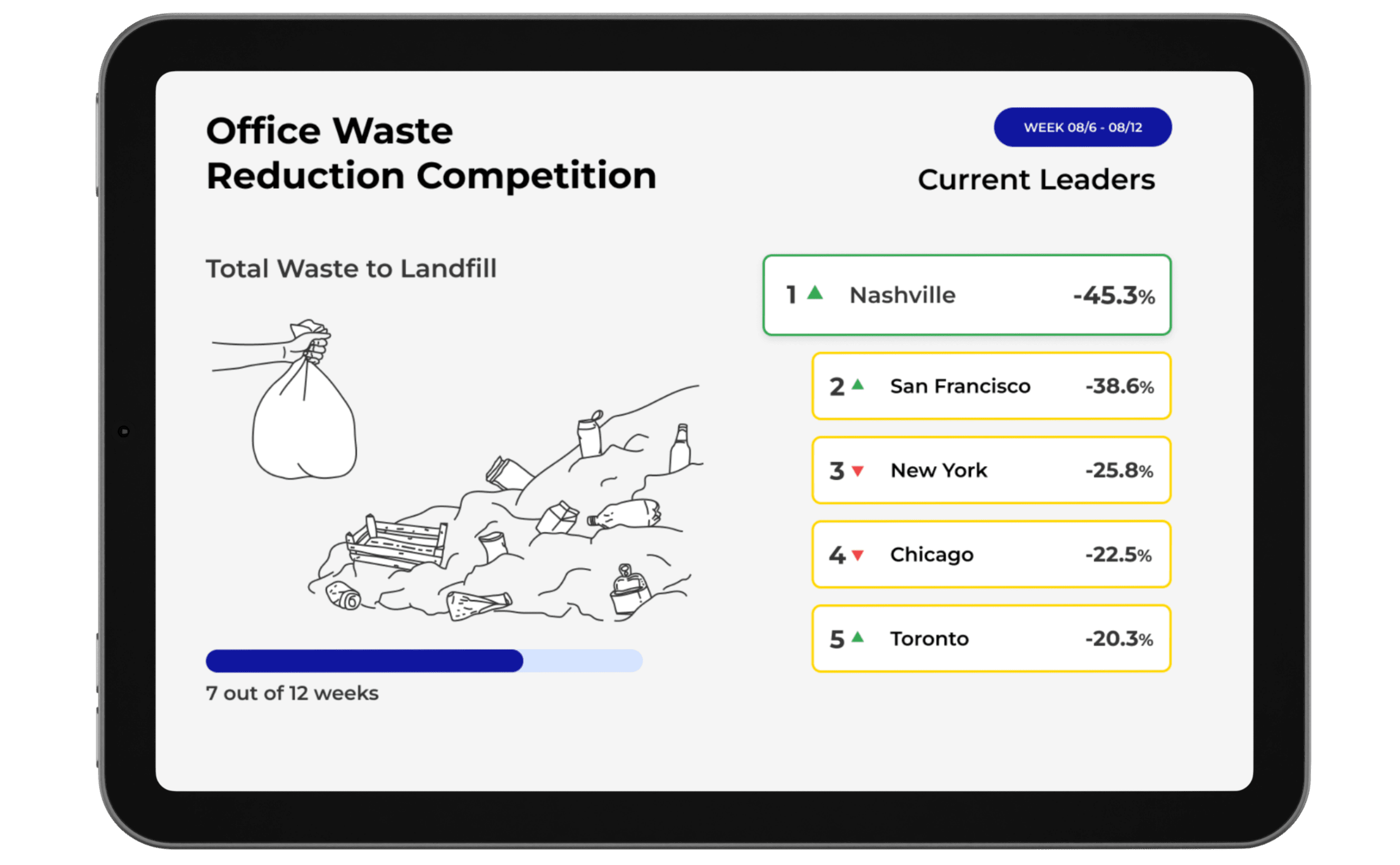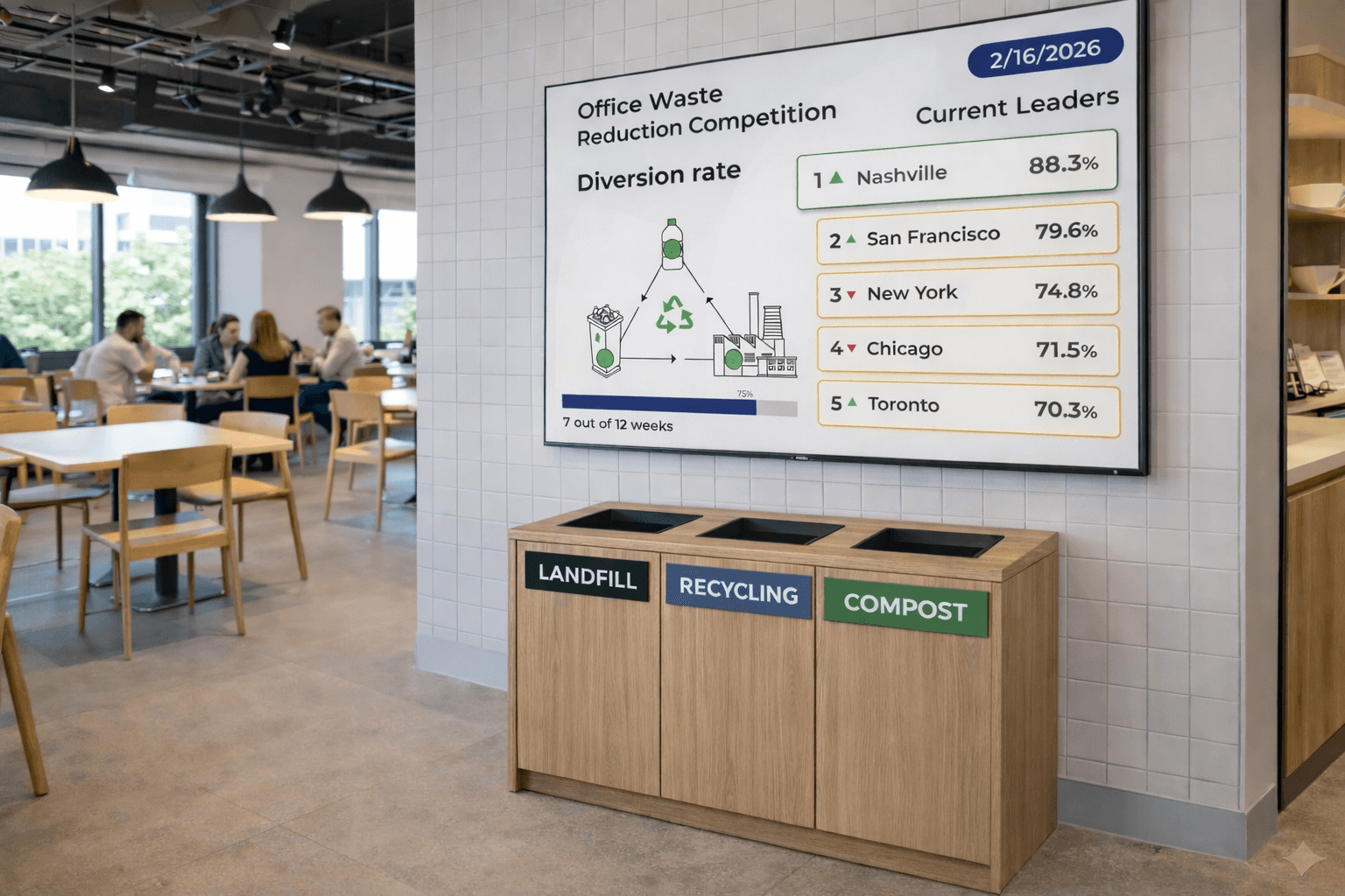 Run friendly competitions by office, floor, region, or department using diversion, contamination, or waste reduction metrics.